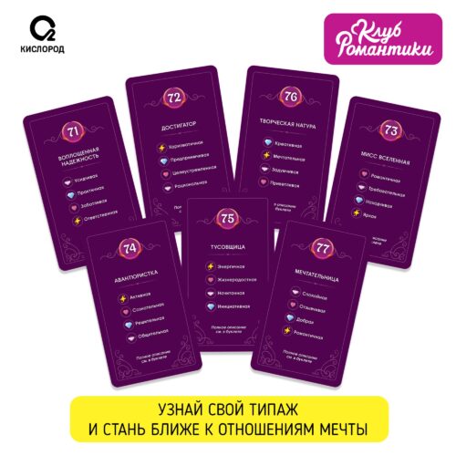 As in your favorite Romance Club games, sequential selection of answers will lead you to your goal - a detailed description of your personality type and advice from a psychologist on which man is right for you!